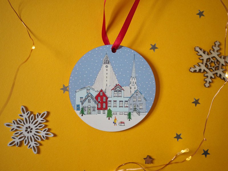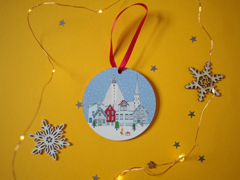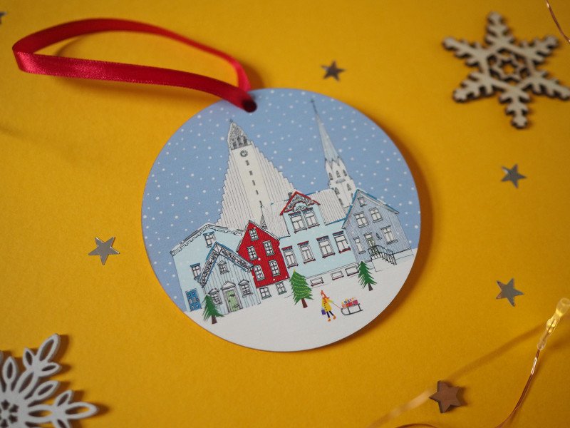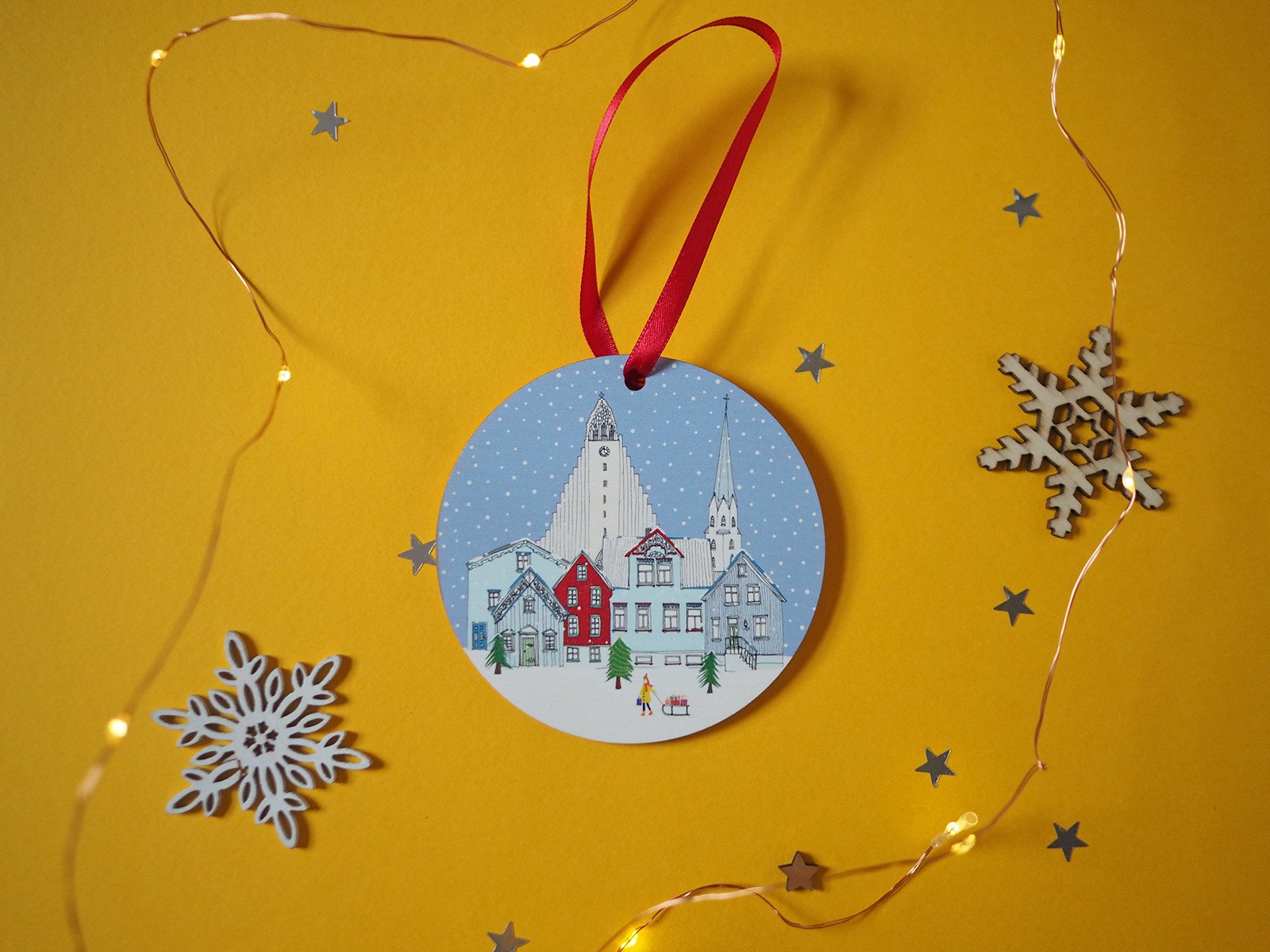 A Reykjavik Christmas decoration illustrated with a snowy Icelandic scene including the Hallgrímskirkja and colourful Nordic houses.