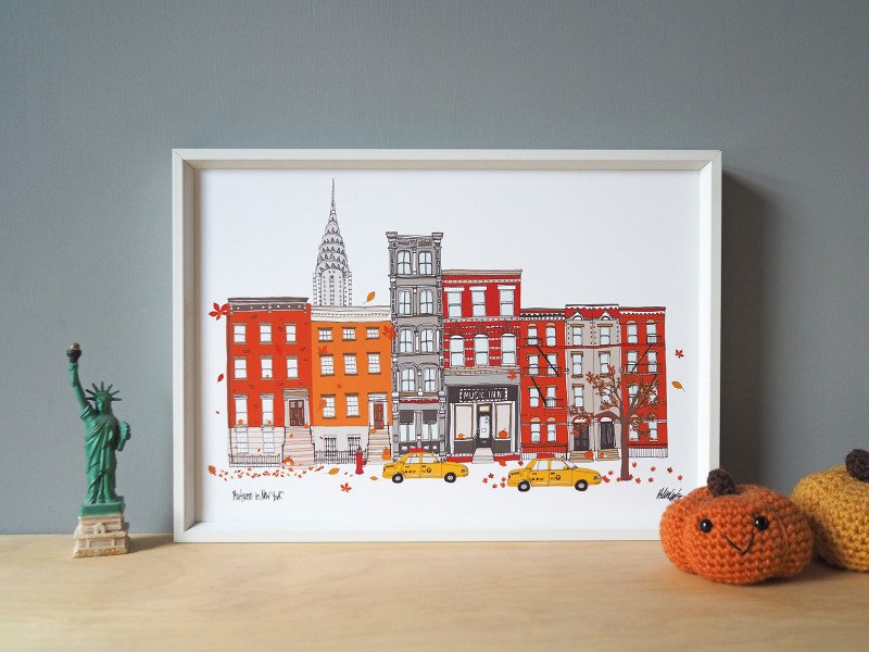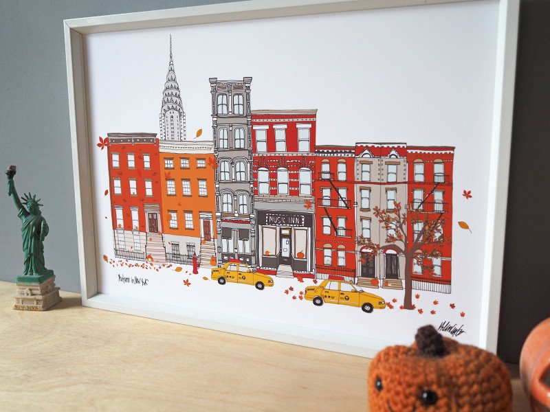 A colourful autumnal New York skyline illustration print, with cosy orange and red brick townhouses, swirling autumn leaves and pumpkins everywhere!
