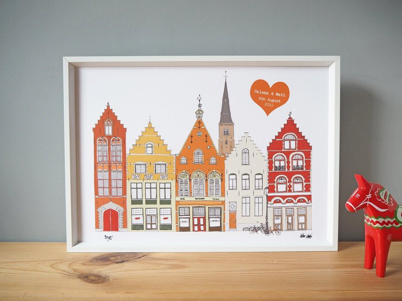 This print is personalised with names and a date, which will be printed in a typewriter style font in white in a coloured heart. You can also choose the colour of the heart - the colours are all picked carefully from the print itself.
