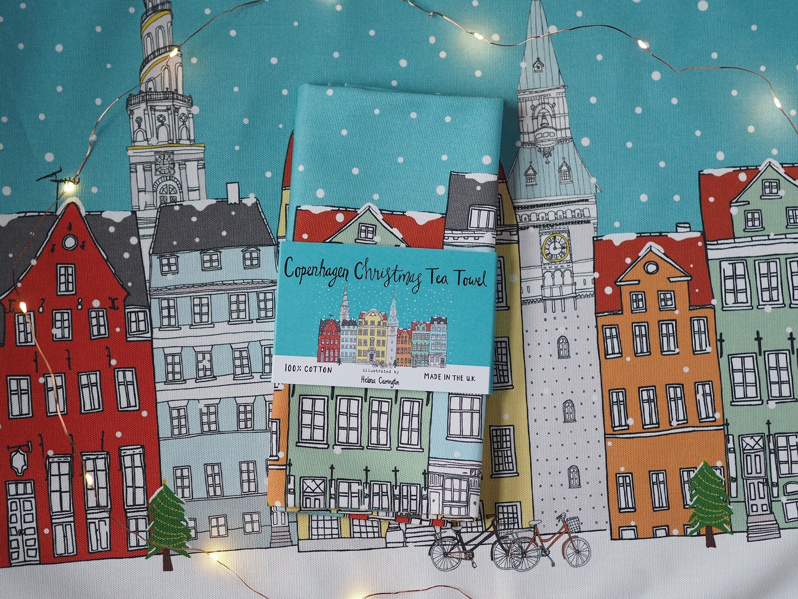 A Copenhagen skyline tea towel in a wintery Christmas scene, featuring illustrations of colourful Nyhavn townhouses in the snow.