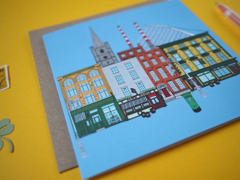 A colourful Dublin skyline card illustrated with buildings including The Winding Stair Bookshop, The Hairy Lemon Pub, some Georgian townhouses, the Poolbeg Towers and a green Irish postbox,