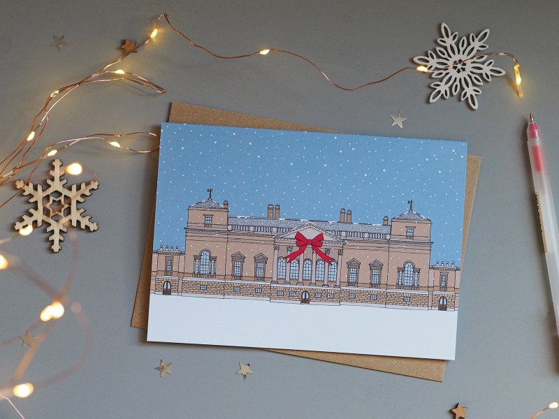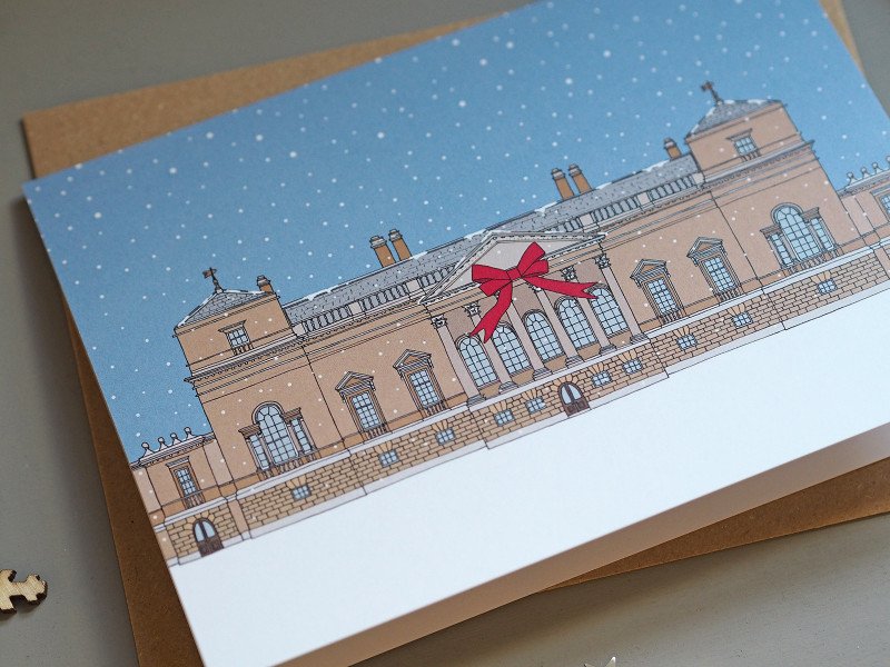 An illustrated Christmas card featuring Holkham Hall in North Norfolk, in a snowy Christmas scene.