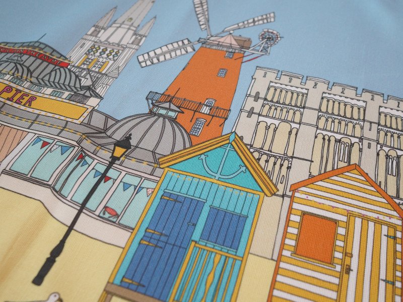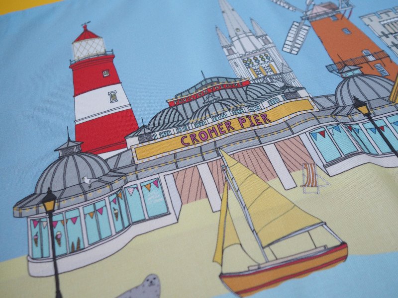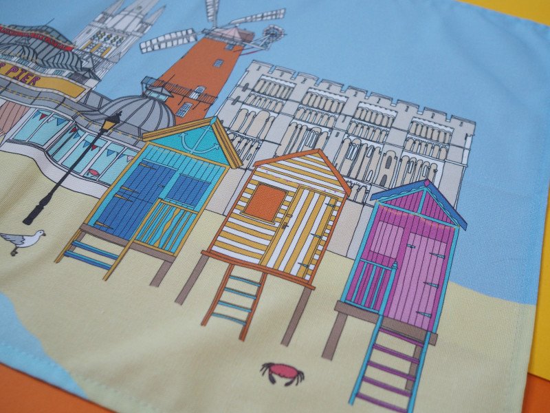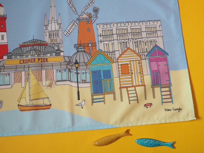 A colourful Norfolk tea towel, illustrated with Norfolk landmarks such as Cromer Pier, Norwich castle and cathedral, Happisburgh lighthouse, Cley Windmill and brightly coloured beach huts at Wells-next-the-Sea.