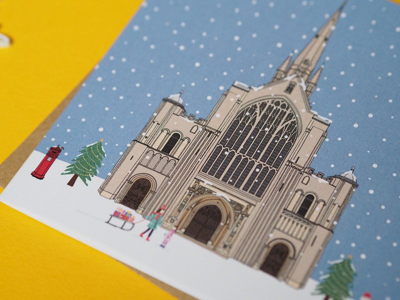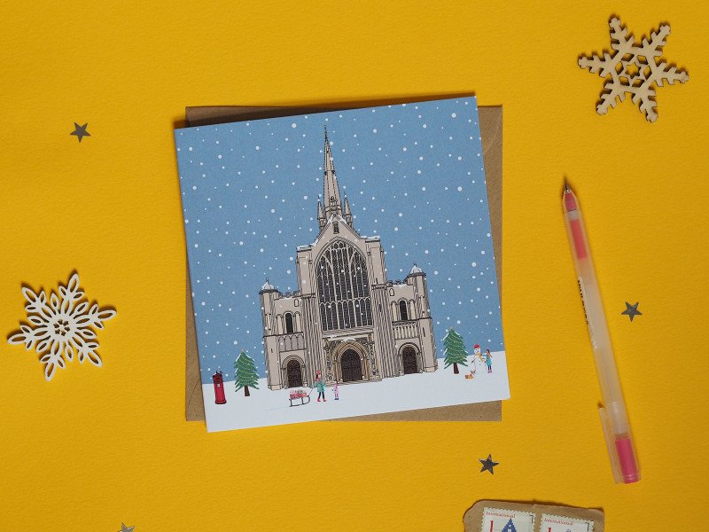 A set of 5 Norwich cathedral Christmas cards in a snowy Christmas scene.