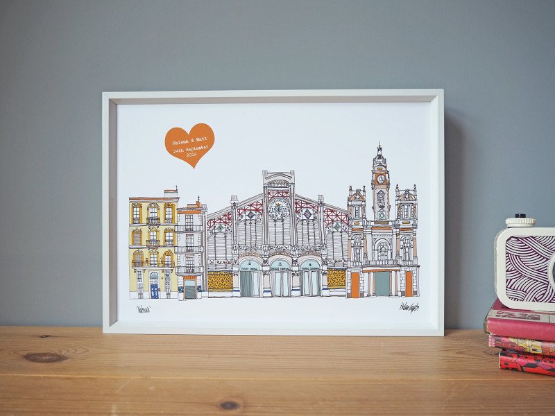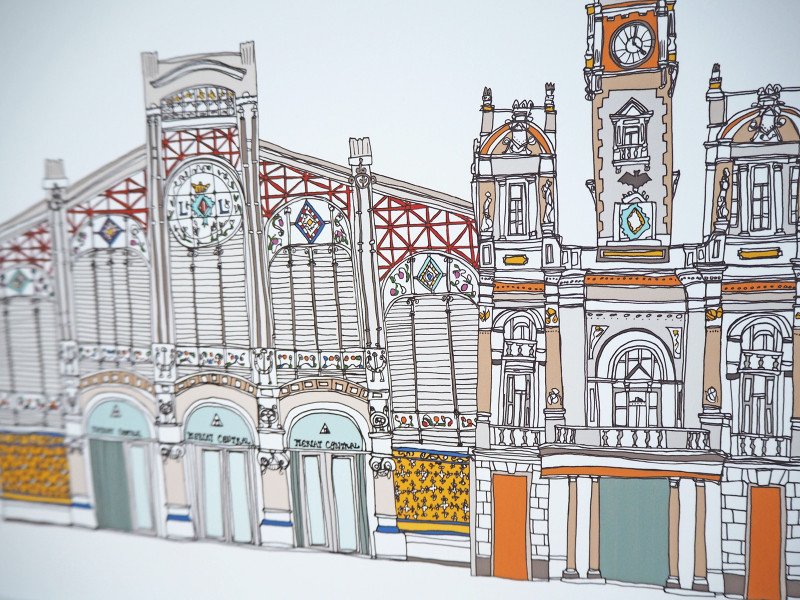 A Valencia skyline print featuring beautiful Spanish townhouses and landmarks such as the central market.