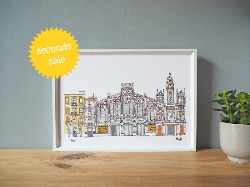 A Valencia skyline print, featuring pretty Spanish townhouses and landmarks such as the famous central market building.