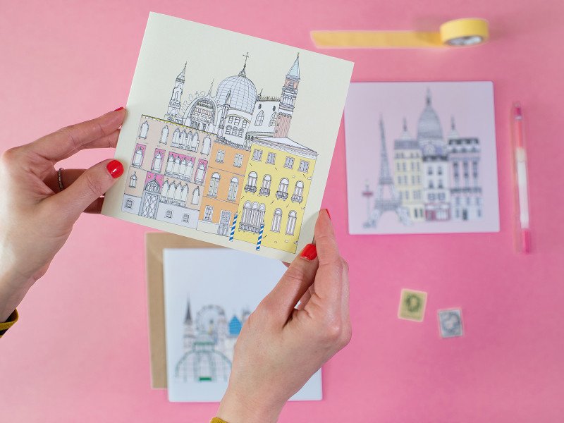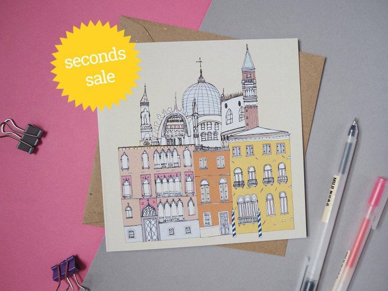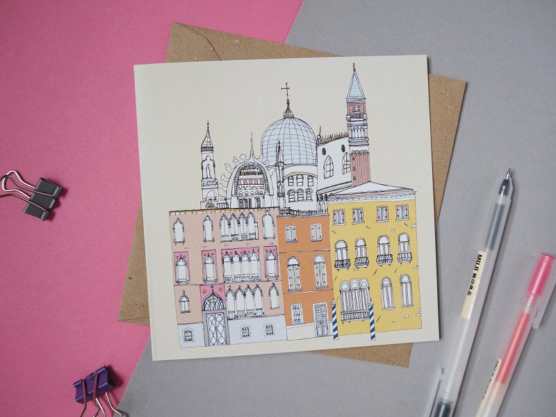 A Venice card featuring the Campanile and Basilica in St Mark's Square, and some Venetian townhouses.